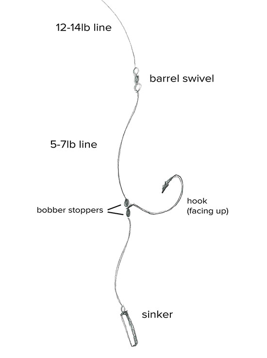 I received a couple messages from people not quite understanding the dropshot rig I have pictured. I just added a rough diagram that helps explain it. The only difference between the diagram and my set up is I use 17lb fluro and a VMC spinshot hook which I tie directly to.