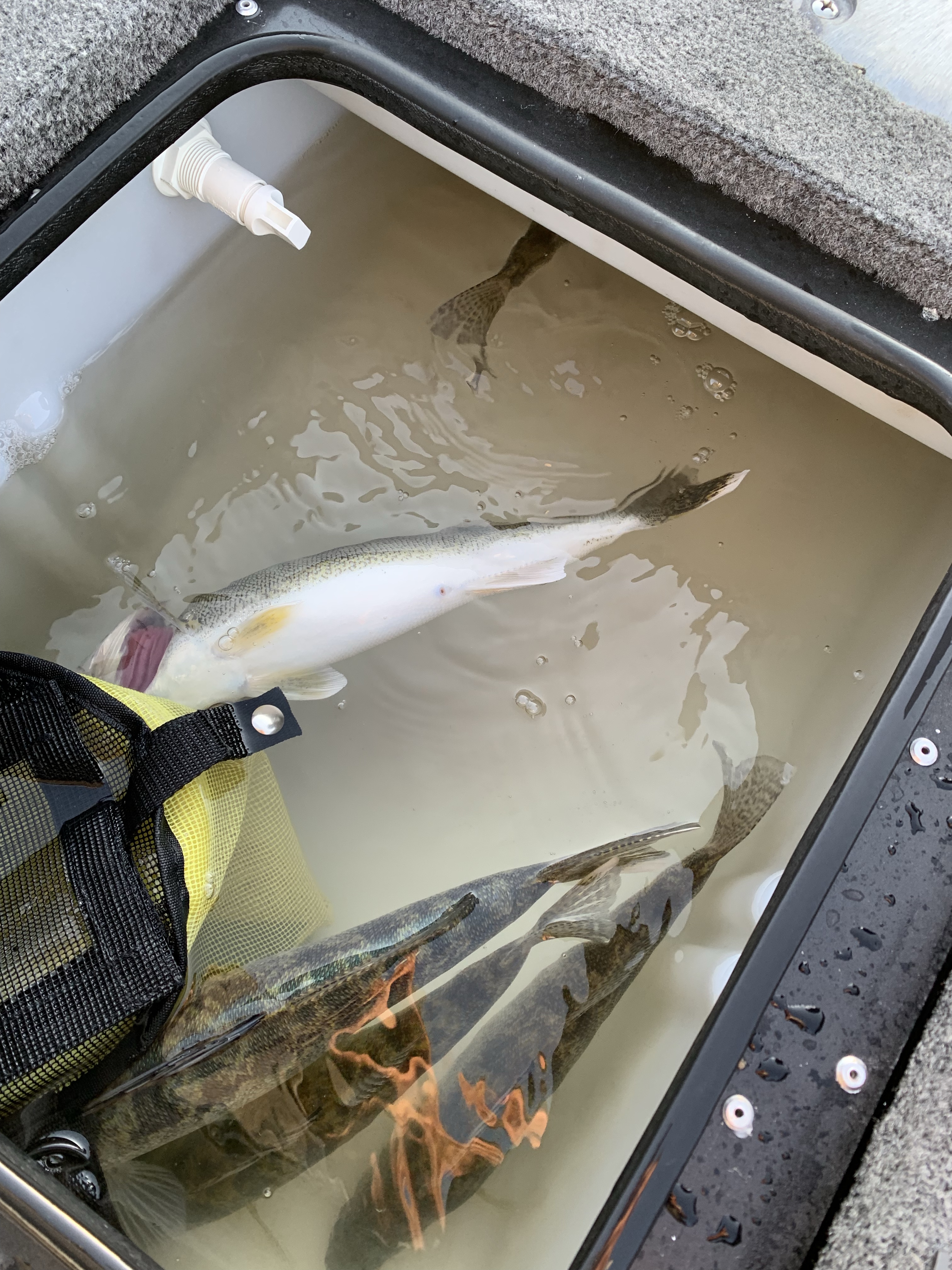 The first 10 minutes we tried pulling spinners, but on the Livescope, you could see the fish follow but then would turn away. We quickly switched gears and slip bobbered and drop-shotted leeches on the same spot. Doubles were happening left and right and we stacked em up quick.